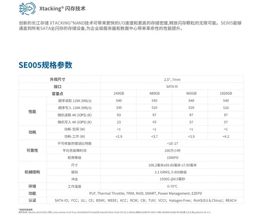 長江存儲企業級SATA SSD SE005容量點為240G~1.92T,尺寸2.5寸,順序讀寫分別高達540/510 MB/s,隨機讀寫分別高達98/59 KIOPS,小容量點適合作為服務器啟動盤使用。